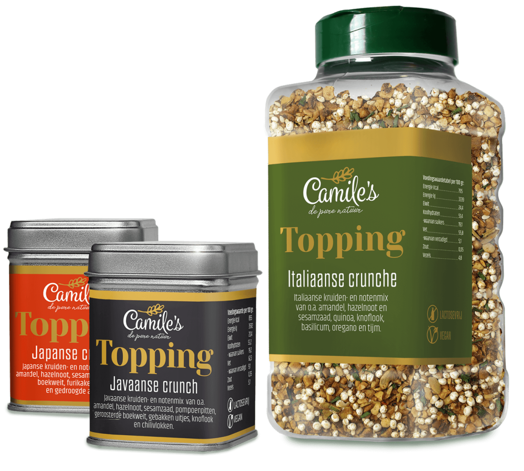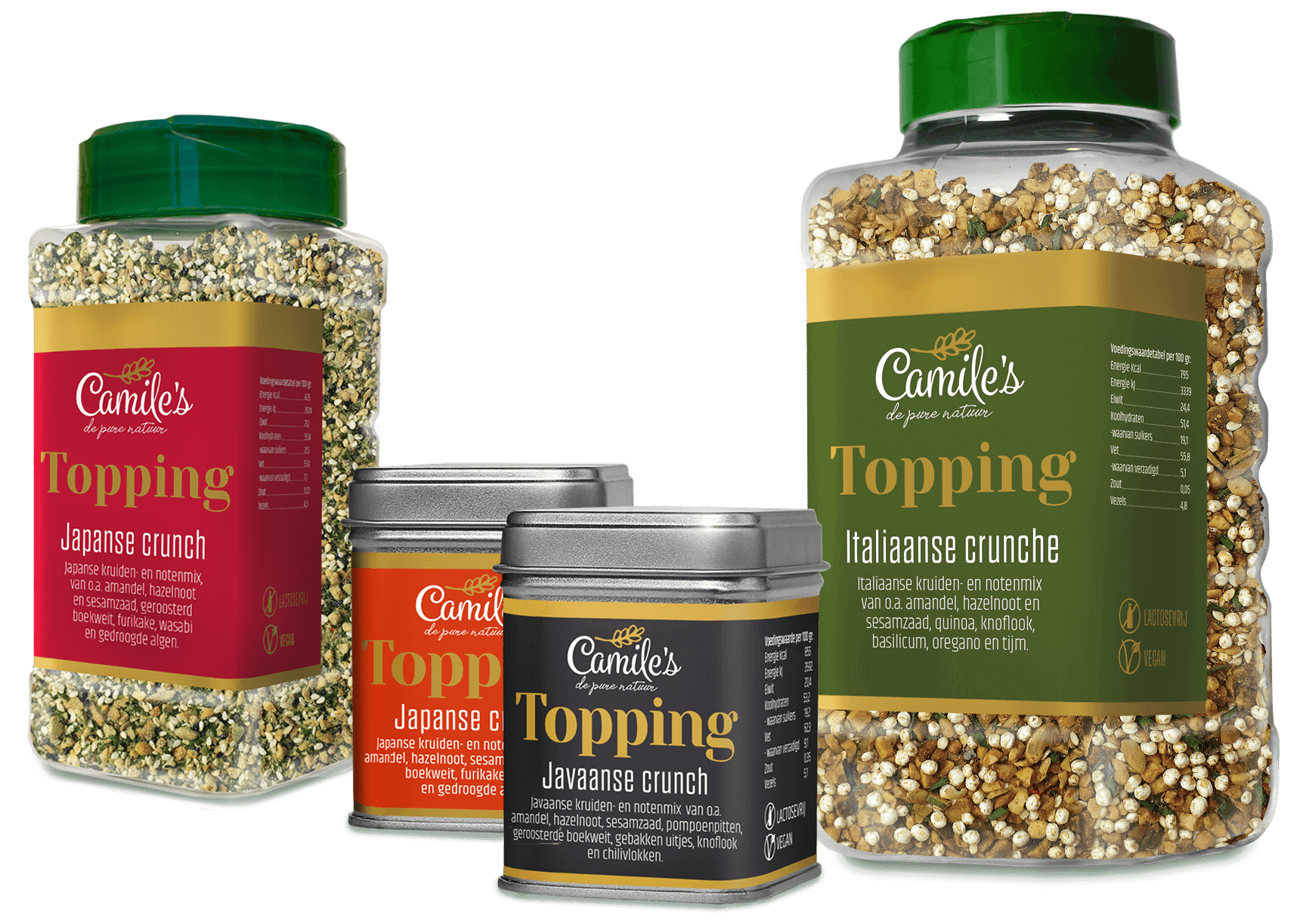 Camiles Toppings zijn onmisbaar in iedere grootkeuken! Met 7 verrassende combinaties van noten, kruiden en specerijen maakt u gemakkelijk heerlijke gerechten met vlees, vis, salades en nog veel meer. Laat uw creativiteit de vrije loop en ontdek deze “toppers”!