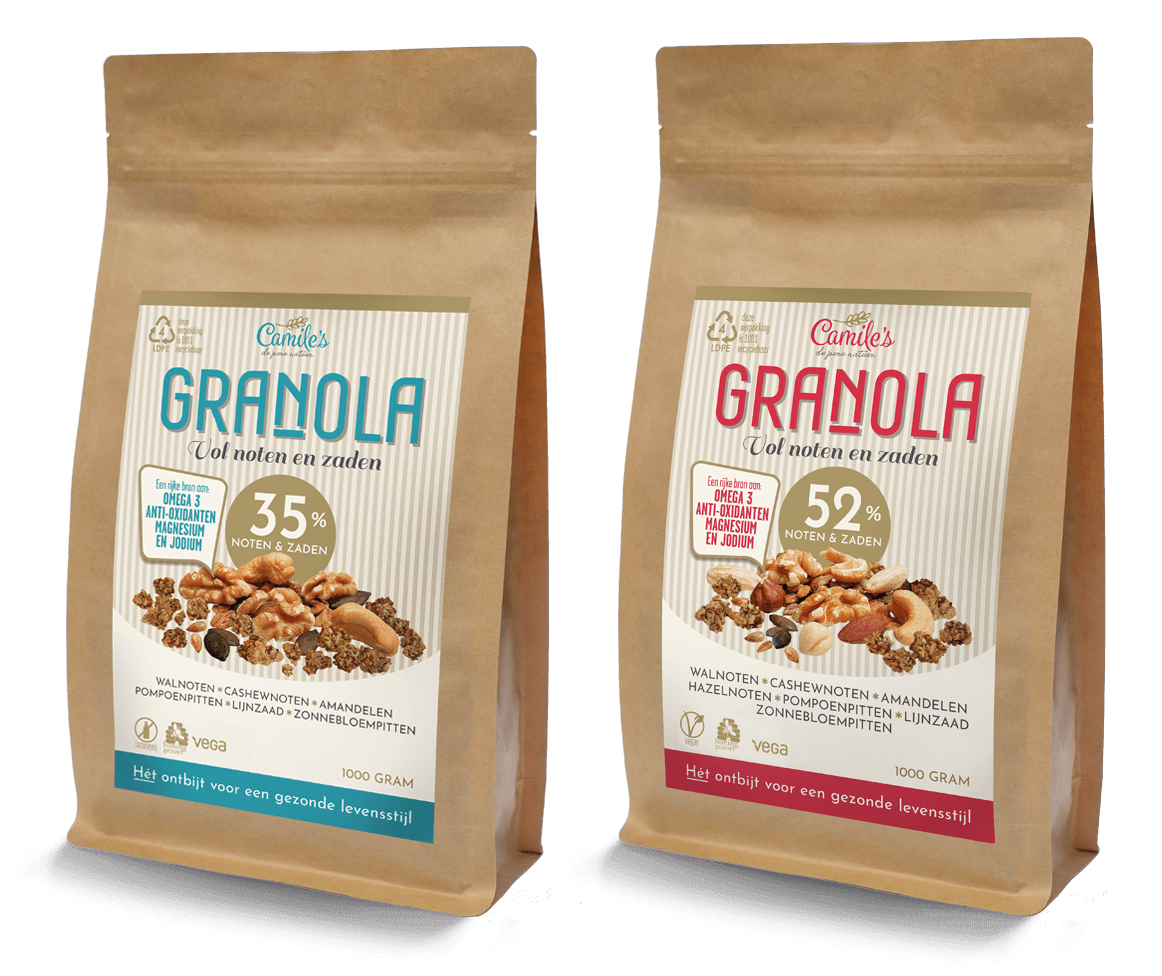 Camile’s Granola is een pure, eerlijke en vooral heerlijke granola. De granola’s worden ambachtelijk bereid door onze lokale bakkers en zijn super gezond én knapperig vers. Met uitsluitend 100% natuurlijke ingrediënten van de beste kwaliteit is Camile’s Granola daarmee niet alleen de allerlekkerste maar ook de Granola met het hoogste percentage noten!