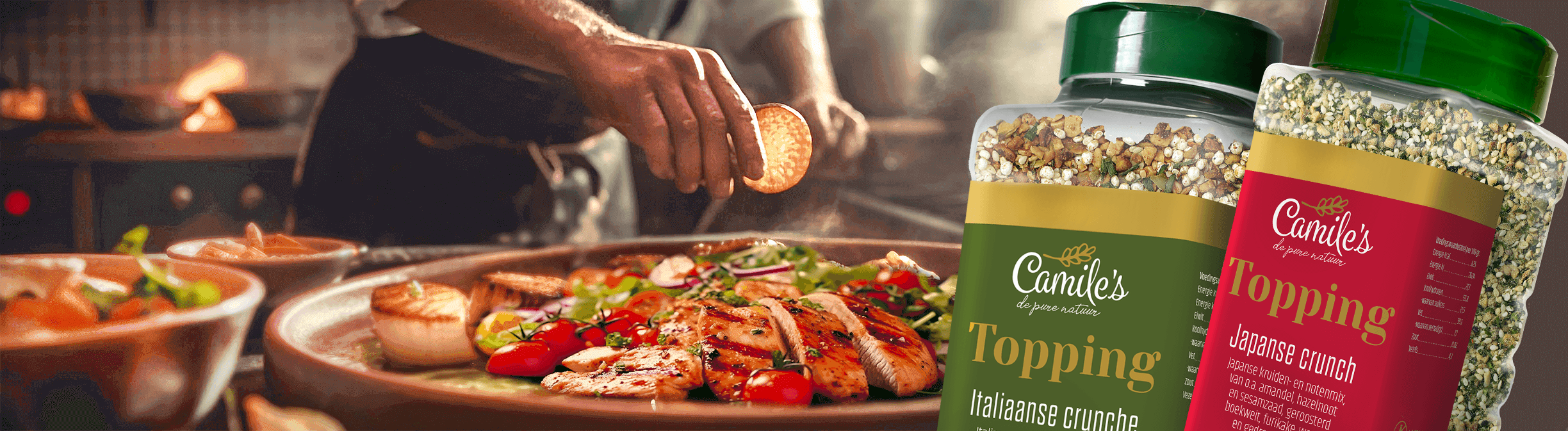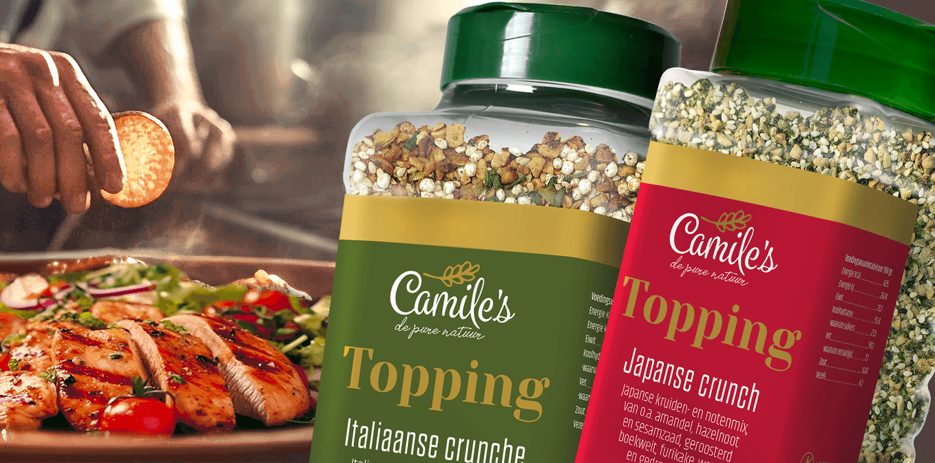 boekweitgrutten, amandelen, hazelnoten, sesamzaad, pompoenpitten, koolzaadolie, peterselie, dille, ui, knoflookgranulaat, tomatenpoeder, basilicum, oregano, dragon, paprikapoeder, rozemarijn, tijm, kurkuma, palmolie, mosterd, marjolein, uienpoeder, zeezout, bieslook, boekweitbloem, gemalen peper, koriander, chili peper, fenegriekzaad, gember, komijn, lavas, zout, karwijzaad, chilipeper, voedingszuur: citroenzuur